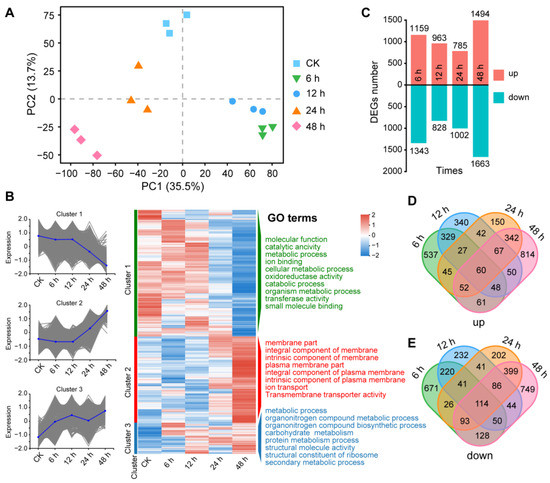 Differential expression genes of A. solani treated with crude protein extracts from XJ5. (A) Principal component analysis (PCA) showing the relatedness among the three biological replicates of RNA-seq samples. PCA was plotted by the first two axes (PC1 and PC2). Different colored shapes represent different samples. (B) GO analysis of DEGs in each sample. (C) Number of DEGs between different samples. The X-axis displays different comparison samples, and the Y-axis displays the number of genes. Red represents upregulated DEGs, and cyan represents downregulated DEGs. (D) Venn diagram showing the overlap of upregulated genes among different samples, numbers in the overlapping area indicate the number of genes that were co-upregulated between different samples. (E) Venn diagram shows the overlap of downregulated genes among different samples; numbers in the overlapping area indicate the number of genes that were co-downregulated between different samples.