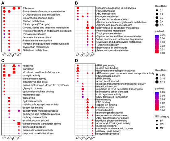 Enrichment analysis of differential expression genes. (A) GO analysis of upregulated genes. Bubble chart depicting the GO enrichment of upregulated genes after 6 h, 12 h, 24 h, and 48 h of treatment. The bubble color indicates the P value of the hypergeometric test for GO enrichment, and the bubble size indicates the ratio of the GO term relative to the background gene set. (B) GO analysis of downregulated genes. (C) KEGG pathway enrichment analyses of upregulated genes. (D) KEGG pathway enrichment analyses of downregulated genes.