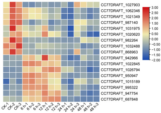 Expression pattern of chitin synthase, O-glycosylation, and N-glycosylation-related genes after 6 h, 12 h, 24 h, and 48 h of treatment. Heatmap was plotted using Z-score normalized transcript per million (TPM) values of the related genes by TBtools. Columns represent replicates of each sample and rows represent individual genes. Upregulated genes are in red, and downregulated genes are in blue.