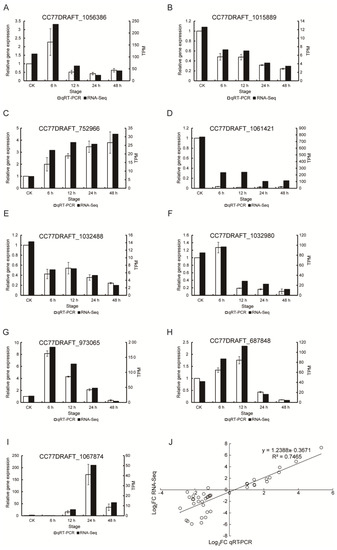 Validation of RNA-seq data by qRT-PCR. (A–I): Expression patterns of nine expressed genes in various databases. (J) Correlation dot plot between RNA-seq and qRT-PCR expression patterns.