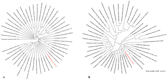According to the article by Girard L. et al. [48], the group of fluorescent pseudomonads includes the following species: P. allii, P. antartica, P. asgharzadehiana, P. aylmerense, P. azadiae, P. azotoformans, P. canadensis, P. carnis, P. cedrina subsp. cedrina, P. cedrina subsp. fulgida, P. costantinii, P. cremoris, P. cyclaminis, P. edaphica, P. extremaustralis, P. carnis. cremoris, P. cyclaminis, P. edaphica, P. extremaustralis, P. extremorientalis, P. fildesensis, P. fluorescens, P. grimontii, P. haemolytica, P. kairouanesis, P. karstica, P. khavaziana, P. kitaguniensis, P. lactis, P. libanensis, P. lurida, P. marginalis, P. nabeulensis, P. orientalis, P. palleroniana, P. panacis, P. paracarnis, P. paralactis, P. paralactis, P. pisciculturae, P. poae, P. rhodesiae, P. salmasensis, P. salomonii, P. simiae, P. sivasensis, P. spelaei, P. synxantha, P. tolaasii, P. tritici, P. trivialis, P. veronii, P. yamanorum. The authors recommended the estimation of the phylogenetic relationships of the strains on the basis of the rpoD gene (Figure 1B). However, even using this approach, it was not possible to determine the species assignment of the strain. It can be noted that, based on the trees presented (Figure 1A,B), the closest species to the studied strain are P. veronii and P. fildesensis. However, there are currently no whole-genome type strains of these two species. So, it is not possible to make a detailed comparison of genome structure using, for example, the Mauve method.