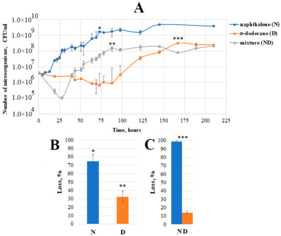 Physiological parameters of growing Pseudomonas sp. strain OVF7 in mineral medium with naphthalene (N), n-dodecane (D), and a mixture of naphthalene and n-dodecane (ND). (A)—Growth curves; (B)—Loss of naphthalene and n-dodecane in systems containing only one of these substrates; (C)—Loss of naphthalene and n-dodecane in a system containing a mixture of these substrates; *, **, *** on A denote the time of the end of the exponential growth phase corresponding to the naphthalene and/or n-dodecane loss data on (B,C).
