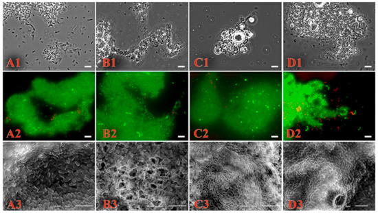 In addition, images obtained by fluorescence microscopy (Figure 4(A2,B2,C2,D2)) showed the formation of biofilms from living cells.