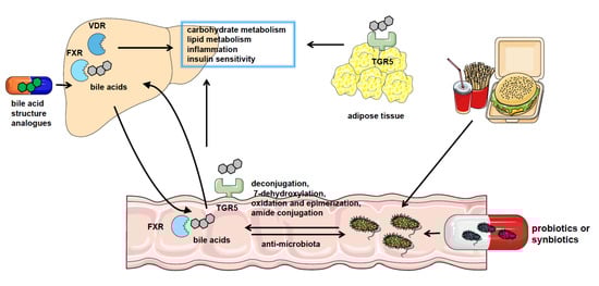 - Chen, J.; Thomsen, M.; Vitetta, L. Interaction of gut microbiota with dysregulation of bile acids in the pathogenesis of nonalcoholic fatty liver disease and potential therapeutic implications of probiotics. J. Cell. Biochem. 2019, 120, 2713–2720. [Google Scholar] [CrossRef]
