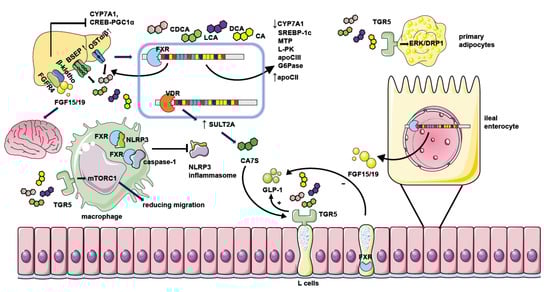 VDR gene variation has been discovered to contribute to significant shifts in the microbiota in a study performing a genome-wide association study of the gut microbiota. The upregulation of VDR is accompanied by a much lower abundance of Parabacteroides, which is positively correlated with LCA concentration []. Interestingly, another research study reveals that sleeve gastrectomy leads to a decrease in Clostridia, resulting in a decrease in LCA in the intestine and an increase in the portal vein. LCA induces hepatic mSult2A1/hSULT2A expression to drive cholic acid-7-sulfate (CA7S) production via activating VDR. CA7S in turn induces GLP-1 secretion in intestinal L cells and improvement of diabetic phenotypes after sleeve gastrectomy in mice []. The complicated mechanism further illustrates the consistent interplay between gut microbiota and bile acids in metabolism regulation. However, the role of PXR is confused as the activation or knockdown of PXR both promote de novo lipogenesis and steatosis [].