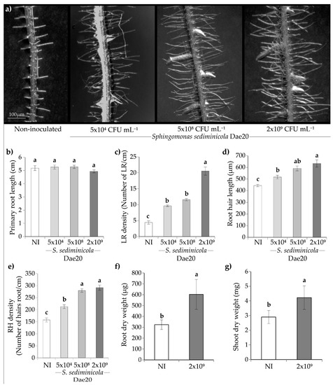 Arabidopsis thaliana root phenotype (a), primary root length (b), lateral root (LR) density (c), root hair (RH) length (d), RH density (e), shoot dry weight (f) and root dry weight (g) of 10-day-old Arabidopsis thaliana not inoculated (NI) or inoculated with different bacterial concentrations expressed as the number of colony-forming units (CFU) of S. sediminicola Dae20. Error bars represent SD. Letters represent a significant difference among modalities.