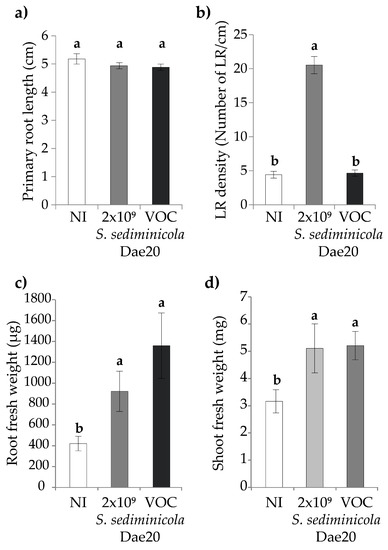 (a) Primary root, (b) lateral root (LR) density, (c) shoot fresh weight and (d) root fresh weight in 10-day-old Arabidopsis thaliana not inoculated (NI), inoculated with S. sediminicola Dae20 or grown in the presence of volatile organic compounds (VOC) released by the bacterial strain. Error bars represent SD. Letters represent a significant difference among modalities.