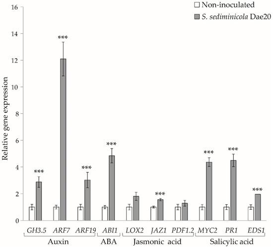 Moreover, we detected an increase in the transcripts of several genes involved the biosynthesis of auxin (GH3.5, ARF7 and ARF19), abscisic acid (ABI1), jasmonic acid (JAZ1) and salicylic acid (MYC2, PR1 and EDS1) in plants inoculated with S. sediminicola Dae20 (Figure 4).