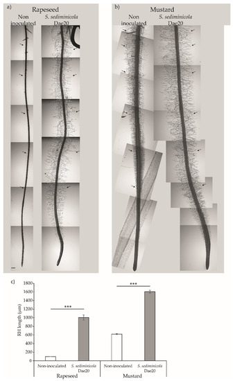 As in Arabidopsis, the development of the root system of mustard or rapeseed seedlings was also influenced by the presence of S. sediminicola Dae20. Indeed, the production of soluble and volatile organic compounds by the bacteria during the 7-day growth period stimulated the presence and elongation of root hairs in rapeseed and mustard (Figure 5a–c).