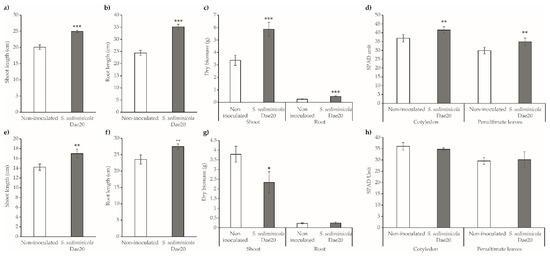 Phenotypic traits of non-inoculated (white bar) and Sphingomonas sediminicola Dae20-inoculated (gray bar) mustard (a–d) and rapeseed (e–h) plants. (a,e) Shoot length; (b,f) root length; (c,d) shoot and root dry biomass; (d,h) SPAD values of cotyledons and penultimate leaves. Statistical differences were based on Kruskal–Wallis rank sum tests with Holm’s p-adjust. *, p < 0.05; **, p < 0.01; ***, p < 0.001.