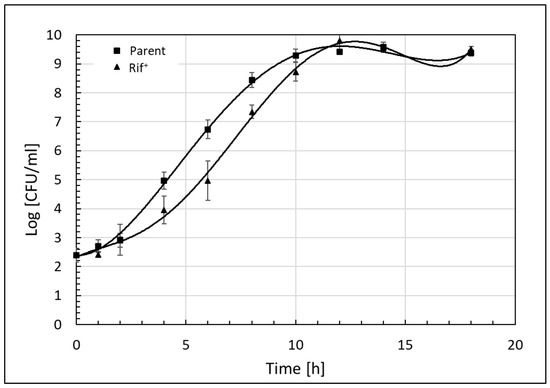 Figure 1 shows the parent Salmonella Senftenberg exhibited quicker entry into logarithmic growth versus the Rif+ mutant, with a significantly shorter lag period versus the drug-resistant mutant (p = 0.024; Table 1).