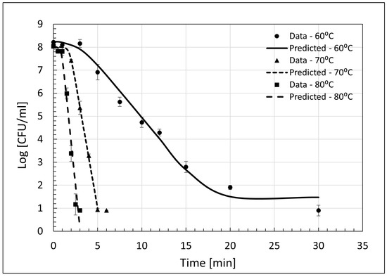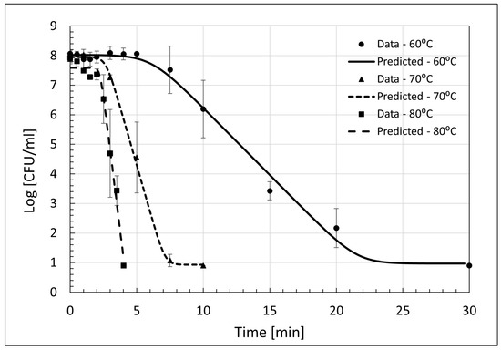 Survival of rifampicin-resistant Salmonella Senftenberg 775W inoculated on chicken blood predicted by Geeraerd et al.’s [17] model at temperatures 60, 70, and 80 °C. Symbols depict the means of three identical complete replicates (N = 3); error bars depict one sample standard deviation from the mean. Surviving Salmonella were enumerated on tryptic soy agar supplemented with 100 μg/mL rifampicin following 24 h of incubation at 37 °C.
