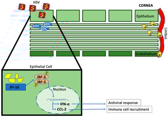 Once physical barriers are breached on or within the eye, innate immune mechanisms serve to rapidly identify the pathogen. While the overall immunological response of the eye may slightly differ compared to that of other sites, innate immune sensors are expressed throughout the eye [19,20,21,22,23]. Much like those found in other tissues, Toll-like receptors (TLRs) and other innate sensors recognize conserved pathogen-associated molecular patterns and activate Myeloid differentiation primary response protein (MyD)88-dependent and -independent pathways following complex interactions with other inflammatory receptors [24,25]. NF-κB-related pathways and/or type I interferon (IFN) pathways are preferentially activated by these innate immune sensors [22,26]. Activation of these pathways leads to local innate immune responses including the production of chemokines to facilitate leukocyte trafficking and priming of the more pathogen-specific adaptive immune response [26]. The interplay between many of these pathways will be further highlighted below regarding specific pathogens within distinct areas of the eye.