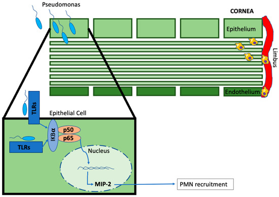 The host response to P. aeruginosa in the cornea is complex. In a mouse model of P. aeruginosa-associated keratitis, a loss of signals emanating from the MyD88 adaptor protein resulted in uncontrolled bacterial replication and spread; however, the loss of neutrophil recruitment resulted in a less severe corneal pathology in these same mice [108]. These findings emphasized the role of neutrophils in the cornea to contain the pathogen but at a cost of worsening local tissue destruction. This was supported with the knockdown of TLR-9 expression resulting in higher bacterial loads but fewer infiltrating polymorphonuclear leukocytes/neutrophils (PMNs) and corneal perforations, reduced inflammatory chemokine concentrations, and clearer corneas compared to controls [109]. Interestingly, the loss of TLR-4 in these infections reduced bacterial defense but also led to increased mRNA expression of proinflammatory cytokines, more infiltrating neutrophils, and higher rates of corneal perforation [110]. Thus, TLR-4 and -9 appear to have roles in bacterial containment but diverging roles in the development of a proinflammatory milieu. Pretreatment of the cornea with the TLR-5 agonist, flagellin, a known innate immune sensor of P. aeruginosa, through an interferon regulatory factor (IRF)-1-dependent pathway, reduces susceptibility to infection (Figure 2) [111,112]. Taken together, TLR activation within the cornea has protective and destructive implications within the cornea. It is unclear if each of these TLRs regulate specific responses or are redundant, activating similar downstream pathways.