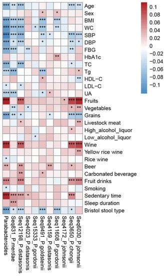 The detection rate of Parabacteroides was 97.50% (5697/5843) in the GGMP (Additional File S1: Figure S1A). The mean relative abundance of Parabacteroides was 0.96%, ranking 24th at the genus level. After denoising, there were ten sequence-level Parabacteroides units detected, namely, Seq831 (P. merdae), Seq12198 (P. distasonis), Seq4023 (P. distasonis), Seq15333 (P. gordonii), Seq9491 (P. goldsteinii), Seq4159 (P. distasonis), Seq11608 (P. gordonii), Seq4172 (P. johnsonii), Seq3650(P. chongii), and Seq6030(P. johnsonii), which accounted for more than 80% of the abundance of Parabacteroides (Supplementary File S1: Figure S1B). Seq831 (P. merdae) was the most prevalent (4676/5843) and the most abundant (mean relative abundance: 0.41%) at the sequence level (Supplementary File S1: Figure S1B). The abundance of Parabacteroides decreased with an increasing age, BMI, WC, SBP, SDP, FBG, TC, Tg, LDL-C, UA, grain intake, and Bristol stool type but increased with increasing fruits intake; wine, beer, and fruit drink consumption; and sedentary time (Figure 2). At the sequence-level, Seq831 (P. merdae), Seq12198 (P. distasonis), and Seq9491 (P. goldsteinii) were negatively correlated with blood pressure, BMI, WC, and Bristol stool type, whereas Seq4023 (P. distasonis) was positively correlated with BMI and WC (Figure 2).