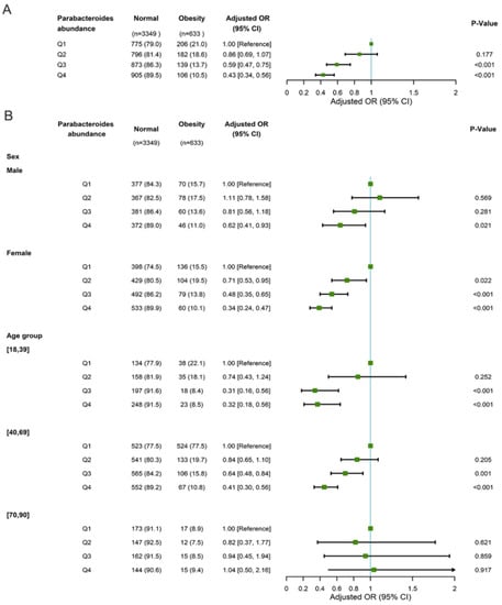 Multivariable logistic regression regarding associations between Parabacteroides abundance and obesity adjusted for age and gender (A) and stratified according to sex and age (B) in the GNSH cohort. Abbreviations: OR, odds ratio; CI, confidence interval.