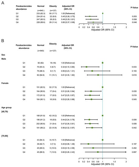 Multivariable logistic regression regarding associations between Parabacteroides abundance and obesity adjusted for age and gender (A) and stratified according to sex and age (B) in the GGMP cohort. Abbreviations: OR, odds ratio; CI, confidence interval.