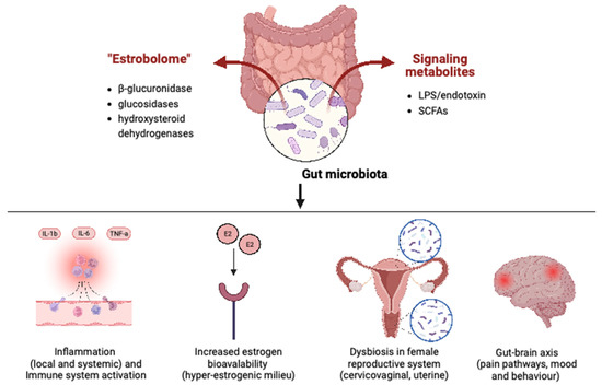 Dysbiosis in the microbiota has also been suggested to play a role in diseases with partially undisclosed pathogenesis, including two closely related conditions: endometriosis [,,] and irritable bowel syndrome (IBS) [,,]. Several hypotheses have been proposed to link these two diseases, such as hormonal dysregulation, immune system dysfunction, and shared genetic factors. While the precise underlying mechanisms connecting endometriosis and IBS are not yet fully understood, recent studies have implicated an intricate interplay between the microbiota and the host in the pathogenesis of these complex, chronic, and multifactorial disorders. In particular, host–microbiota interactions are known to play a fundamental role in immune system development, thus potentially contributing to the onset, development, and maintenance of immune-mediated diseases and chronic disorders [], potentially including IBS and endometriosis.