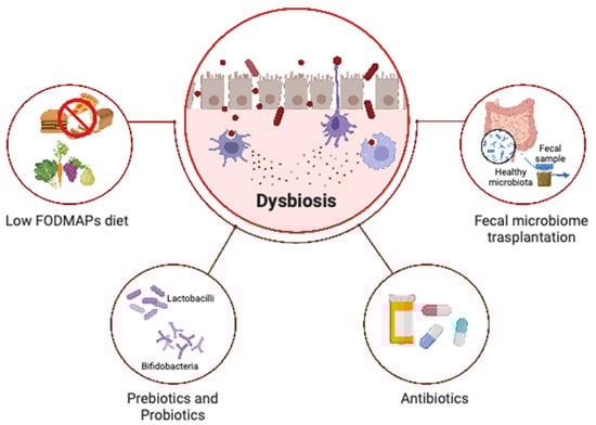 The role of the microbiota in the pathogenesis of IBS has prompted the exploration of therapeutic measures aimed at improving symptoms by targeting the patients’ microbiota. These interventions include dietary modifications, the use of prebiotics and probiotics, antibiotics (rifaximin), and fecal microbiota transplantation (FMT).
