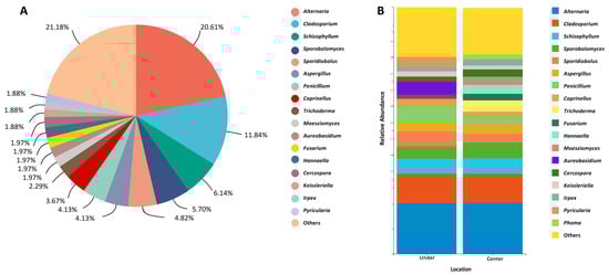 Relative abundance of airborne fungal genera isolated from the analyzed bridges. (A) Overview of total fungal diversity from all sampling sites. (B) Genus-level fungal diversity at the center of and under the bridges. Fungal genera with very low relative abundances (<1%) were merged as “others” in the bar plot.