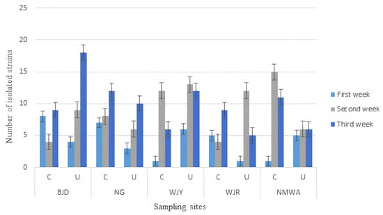 The fungal concentration, expressed in CFU/m3, varied at each sampling location, site, and week (Supplementary Figure S3), ranging between 10 and 180 CFU/m3 (Supplementary Table S4). The sampling site BJD (U) showed the highest fungal concentration value during week 3 (180 CFU/m3), followed by NMWA (C) with 150 CFU/m3 at week 2, while the lowest concentration (10 CFU/m3) was measured at the three sampling sites WJY (C), WJR (U), and NMWA (C), during the first week of sampling. The highest average fungal concentration (103.33 CFU/m3) was recorded at BJD (U) and at WJY (U), whereas the lowest value (56.67 CFU/m3) was measured at NMWA (U) (Table 1 and Supplementary Figure S4).