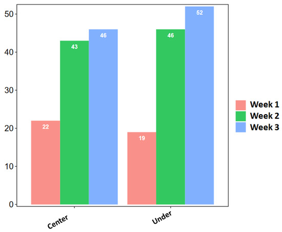 Looking at the different sites and weeks of sampling (Figure 3), the site BJD (C) showed the highest fungal diversity during the first week (8 strains), yielding 19.5% of the total collected strains from the analyzed bridges. In week 2, the highest number of strains (15) was isolated from the site NMWA (C), accounting for 16.9% of the total recorded fungi. During week 3, BJD (U) yielded the highest number of fungal strains (18), representing 18.4% of the total strains collected. Overall, the third week of sampling showed the highest fungal presence, yielding a total number of 98 strains, 46 strains collected at the center of the analyzed bridges and 52 collected under the bridges, followed by the second week with 89 strains. The first week showed the lowest presence of fungi (41 strains), with 22 and 19 strains collected at the center of and under the bridges, respectively (Figure 4).