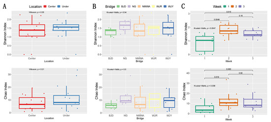 Fungal alpha diversity (Shannon and Chao indexes) in different locations at the center of and under the analyzed bridges (A) at different bridges (B) and sampling weeks (C). Differences between groups were evaluated by Wilcoxon rank-sum test and Kruskal–Wallis test as indicated by p-values.
