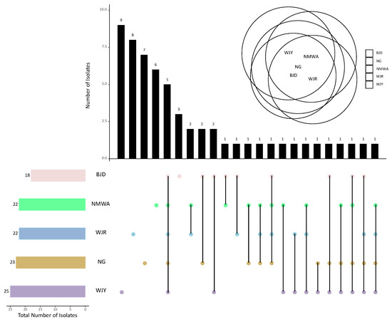 Number of common and unique fungal genera collected from the five sampling bridges by upset-Venn diagram (bridge names are abbreviated as described in the Supplementary Table S1).