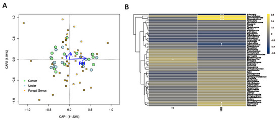 Influence of environmental variables on the fungal community. (A) Distance-based redundancy analysis of the fungal communities, with symbols coded by sampling locations and fungal genera. (B) Correlation heatmap between the detected fungal genera and environmental factors. Different colors refer to Spearman’s correlation coefficient (r). The p value is indicated by: * p < 0.05, *** p < 0.001. T = temperature, RH = relative humidity.