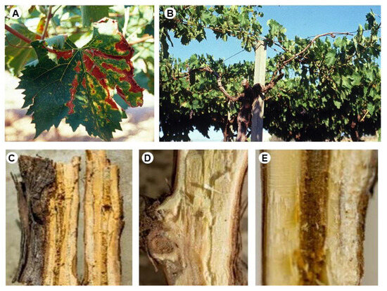 The disease known as ‘Esca’ is one of the longest-recognized and most devastating threats to grapevines (Vitis vinifera) and viticulture around the world [1]. The most recent studies consider this mycopathy as different diseases that overlap in the same vine or develop at different stages of plant life [1,2,3,4,5]. Cross-sections of rooted cuttings, trunk, branches, and shoots show brown to black spots often accompanied by a dark, viscous exudate (‘black goo’). Longitudinally, xylem necrosis extends in columnar strips, called ‘brown wood streaking’ [1,2,3,4,5]. Brown wood streaking affects rooted cuttings (also named brown wood streaking of grapevine cuttings) and young (2–7 years) vines (defined as Petri disease, formerly also known as black goo, slow dieback, and Phaeoacremonium grapevine decline) [1,2,3]. Inside the trunk or the branches, the wood shows ‘white rot’ (which is the origin of the name Esca), as well as cracking or fissuring of the bark and wood (known as ‘mal dello spacco’—cracking disease—in Italy) [1,3,6]. On leaves, small pale green or chlorotic zones, roundish or irregular, occur dispersed to the veins or adjacent the margin. Progressively, these areas increase, merge, and, in part, necrotize, and at last leave only a narrow strip of unaffected green tissue along the main veins. Depending on the cultivar, dead tissues appear dark brown to red-brown and the diseased leaves develop a ‘tiger stripes’ appearance. Occasionally, the necrotic zones of the lamina desiccate and detach and leaf margins become irregular [7]. These symptoms characterize grapevine leaf stripe disease, previously named ‘young Esca’ [1,2,3,4]. Brown wood streaking of rooted cuttings, Petri disease, and grapevine leaf stripe disease manifest in newly grafted plant material, young vines, and adult plants, respectively [1,3]. The concomitant presence of grapevine leaf stripe disease and white rot is described as ‘Esca proper’. Berries display tiny brown spotting (‘black measles’), shriveling, and wilting [1,2,3,4]. Within the Esca complex, white rot and Esca proper can also show apoplectic symptoms: the sudden wilting of whole vines or individual vine arms within a few days, with leaves and grape clusters that usually remain attached to the plant [1,5].