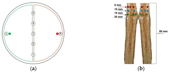 Schemes showing the positions of (a) inoculation plugs (● and ●) and discs taken from the interaction zone (1–5), the potential biological limiter (L, ●), and the pathogen (P, ●); (b) approximate sites of chip recovery (■, ■,■, ■) for grapevine detached cane re-isolation experiments.