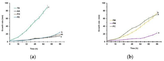 TH colonized the entire Petri dish over 72 h (30.0 mm d−1 radius increment). PO (6.1 mm d−1), PE (4.7 mm d−1), and AA (3.7 mm d−1) reached, after 96 h, 15, 19, and 24 mm, respectively (Figure 3a). Among the tested pathogens (Figure 3b), PC (5.7 mm d−1) was the slowest, while the fastest growth rate was recorded for PM (17.7 mm d−1) and FM (18.7 mm d−1).