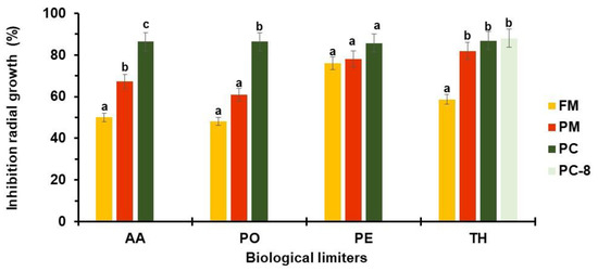 Very high radial growth inhibition was calculated in the AA-PC, PO-PC, PE-FM, PE-PC, PE-PM, TH-PM, TH-PC, and PE-PC8 interactions. High antagonist activity was recovered in the AA-PM and PO-PM relations. Moderate antagonist activity (51–60%) was recovered in the AA-PM and PO-PC groups, while low inhibition rates (about 49%) were retrieved in the PO-FM and AA-FM dual cultures.