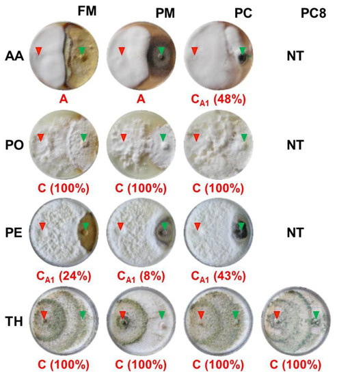 Mycelial interactions after 28 days of dual culture on potato dextrose agar between the potential biological limiters (AA, PO, PE, or TH) and the target pathogens (FM, PM, or PC). PC was inoculated concomitantly (PC) or 8 days in advance of TH (PC8). For acronym definitions, see Table 1. Red letters show the type of interaction as proposed by Badalyan et al. [43,44]: A = deadlock (mutual inhibition in which neither strain was able to overgrow the other) at mycelial contact, C = replacement (overgrowth without initial deadlock), CA1 = partial replacement after an initial deadlock with mycelial contact. In brackets is the percentage of overgrowth 20 days after inoculation. NT = not tested. Red and green arrows indicate the sites where biological limiters and pathogens were inoculated, respectively.