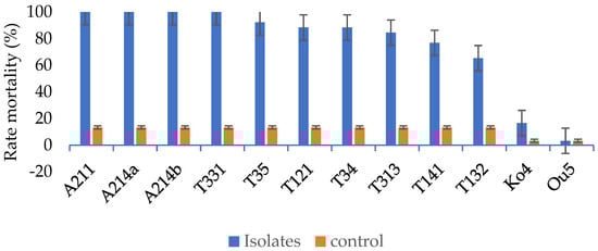 Mortality rate of G. mellonella larvae according to isolates, 7 days after inoculation with 5 × 106 conidia mL−1.
