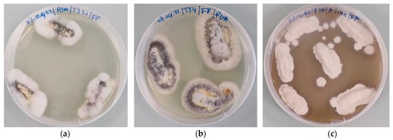 Serial soil dilution suspensions were prepared from 10−1 to 10−7 starting from a stock solution obtained after dissolving 1 g of soil in 9 mL of distilled water. Then, 100 μL of the dilutions from 10−2 to 10−7 were spread on potato glucose agar (PGA, Carl Roth, Arlesheim, Switzerland) in Petri plates in three replicates before all Petri dishes were sealed and incubated at 25 °C in the laboratory. Two days after inoculation, the fungal colonies that appeared were subcultured separately on new PGA dishes in order to obtain pure cultures.