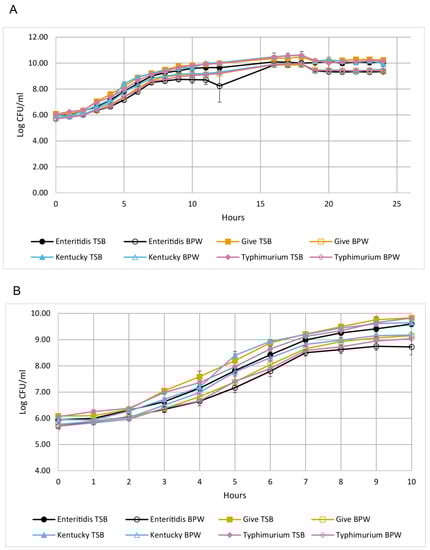 Growth in TSB and BPW was measured in the strains indicated in Table 1. Growth curves over 24 h are shown in Figure 1A. Figure 1B shows the first 10 h of the total 24 h growth to highlight the lag and log phases. The data for the individual strains were grouped according to serovar. The growth curves had similar shapes to each other, and the maximum CFU/mL numbers reached were similar for the serovars in pure culture in each medium. Non-linear regression analysis was performed on the growth data, and the model revealed that the serovars grew at similar rates in both media (Table 3). The lag phase in the Enteritidis strains was longer than in the other serovars (3.0 h vs. 2.3 h). Generation times were similar in TSB and BPW at approximately 0.5 h, with serovars Enteritidis and Typhimurium growing approximately 10% faster in pure cultures. The CFU/mL counts were approximately 1 log lower in BPW, consistent with BPW being a more dilute medium than TSB.