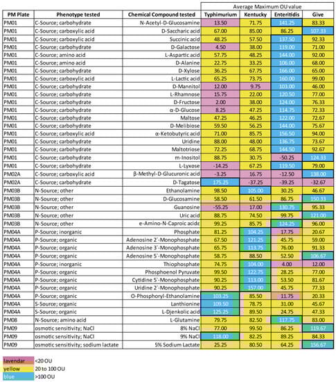 Heat map of 41 phenotype differences between the serovars. Strains were analyzed via phenotype microarray at least three times and background-subtracted, and the averages for strains were grouped into serovars. The numbers (OU range 0–500) are a measure of intensity of redox dye that reflects usage of the compound tested. The type of pre-configured microplates tested, the phenotype tested, and the chemical compound in the well are indicated. Cells are colored to indicate ranges of OU values (<20 OUs: lavender; 20–100 OUs: yellow; >100 OUs: blue).