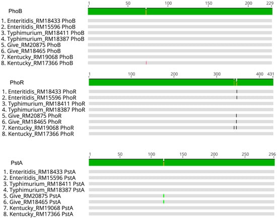 Alignments of predicted protein sequences of PhoB, PhoR, and PstA. Protein sequences were predicted from DNA sequences of the strains indicated. Strains are labeled with the serovar and their RM number. Disagreements in protein sequence are indicated by a gap in the green consensus bar and are shown by a line in the corresponding site in the individual sequences. Green line indicates consensus between the strains. Different color vertical lines in the individual strain sequences indicate amino acid identities between strains.