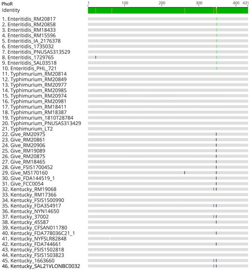 Thirty-eight additional Salmonella Enteritidis, Give, Kentucky, and Typhimurium genomes were used for added analysis of phoR sequences. Some of the additional genomes were from Salmonella strains in our collection that were previously sequenced []. Additional Salmonella genomes were downloaded from Enterobase [,]. The additional genomes used are indicated in Supplementary Table S1. Genome sequences were annotated in RAST, and the phoR gene sequences were determined. Alignments of predicted PhoR amino acid sequences were conducted in Geneious Prime.
