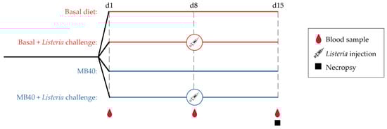Following acclimation, animals were randomly assigned to 4 experimental groups in a 2 × 2 factorial arrangement (2 dietary treatments, with and without LM challenge): (1) basal diet (Basal), (2) basal diet and LM challenge (Basal + LM), (3) MB40-supplemented diet (MB40), and (4) MB40-supplemented diet and LM challenge (MB40 + LM, Figure 1). Each experimental group included 4 gilts and 4 barrows. Bacillus subtilis strain MB40, registered as American Type Culture Collection (ATCC) No. PTA-122264 was derived from the Bacillus subtilis Marburg type strain DSM 10 (ATCC No. 6051) and displayed enhanced spore stability without genetic engineering. MB40 has also demonstrated a robust safety profile and probiotic characteristics in cell culture experiments and clinical trials [,]. Additionally, the United States Food and Drug Administration issued a “no objection letter” for the use of MB40 in foods according to a “generally regarded as safe” (GRAS) dossier []. MB40 was manufactured and provided by BIO-CAT Microbials, LLC (Shakopee, MN, USA). Briefly, MB40 was grown using aerobic fermentation methods to achieve nearly 100% spores. After fermentation, pure MB40 spore culture was concentrated via centrifugation and then spray-dried using maltodextrin as a carrier. In this animal study, MB40 was supplemented at 7.5 billion colony-forming units (CFU) per day by mixing 1 g MB40 (7.5 billion CFU/g) with the basal diet in pelleted form. Experimental diets were fed to animals for 14 days. All diets were formulated to meet or exceed the 2012 National Research Council nutrient recommendations for weaned piglets [] and did not contain antibiotics or pharmaceutical levels of copper or zinc.