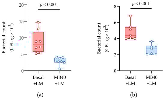 Bacterial invasion of the liver and spleen in challenged animals was investigated by microbial enumeration. Samples from non-challenged piglets were negative for LM. MB40-supplemented animals showed a 67% reduction in liver bacterial counts compared to challenged animals fed basal diet without MB40 (2.91 ± 1.14 vs. 8.75 ± 3.38 CFU × g−1 × 103, p < 0.001, Figure 2a). MB40 supplementation was also associated with a 49% reduction of bacterial counts in the spleen following LM challenge, compared to basal diet (2.46 ± 0.81 vs. 4.84 ± 0.96 CFU × g−1 × 10, p < 0.001, Figure 2b). The presence of bacteria in the liver and spleen, as well as the increased spleen and kidney organ weights, suggest that the dose of LM in this intraperitoneal injection model of listeriosis was sufficient to evoke hepatic and splenic infection and inflammation. Moreover, MB40 supplementation may have mitigated the visceral dissemination of LM from the peritoneal cavity to the liver and spleen.