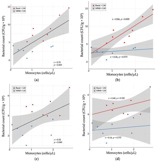 Whole blood and plasma were collected for hematology and cytokine analysis, respectively, from animals at baseline (d1), before LM challenge (d8), and at the end of study (d15). There was a main effect of time on erythrocyte concentration (p = 0.039), hematocrit (p < 0.001), hemoglobin concentration (p < 0.001), packed cell volume (p < 0.001), and segmented neutrophil concentration (p = 0.020), with values lower at d15 compared to d1 (Table 3). Lymphocytes tended to increase by d8 and d15 compared to d1 (p = 0.087), with no effects of diet or LM challenge (Table 3). A main effect of LM challenge was significant for increased leukocyte concentrations (p = 0.027), including neutrophils (p = 0.004), and monocytes (p < 0.021) in LM-challenged animals at d15 compared to non-challenged animals (Table 3). Despite the inflammatory response to LM challenge and increased hepatic and splenic bacterial load, the concomitantly increased concentrations of neutrophils and monocytes fall within standard reference ranges for 6-week-old pigs []. A time × diet effect was significant for eosinophil concentrations (p = 0.032); however, elevated baseline concentrations in the animals prior to MB40 supplementation are confounding (Table 3). More telling for the impact of MB40 on potentially reducing inflammation, a main effect of diet on decreasing monocyte concentrations was observed at d15 (p = 0.007), whereby monocytes in MB40-supplemented animals decreased after LM challenge (d8–d15) and increased in LM-challenged animals fed the basal diet without MB40 (Figure 3).
