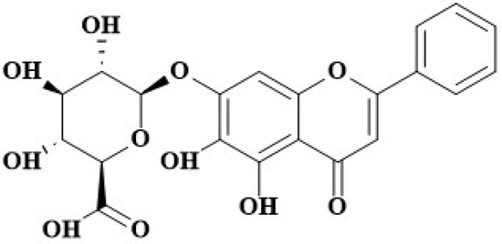 Baicalin (BA; Figure 1), namely baicalein 7-O--D-glucuronide, is a flavonoid compound isolated from medicinal plants such as Scutellaria baicalensis [23]. Multiple studies have highlighted the robust biological activities and significant functions of BA, such as its antimicrobial and antioxidant activities [24]. For instance, it has been demonstrated to possess anti-inflammatory, antioxidant, and anticancer effects on organs like the lungs and the uterus [25,26]. BA can inhibit biofilm formation, attenuate quorum-sensing controlled virulence, and enhance Pseudomonas aeruginosa clearance in mice [27]. BA has been proven to possess inhibitory effects on virulence phenotypes in Pseudomonas aeruginosa and APEC [28,29].
