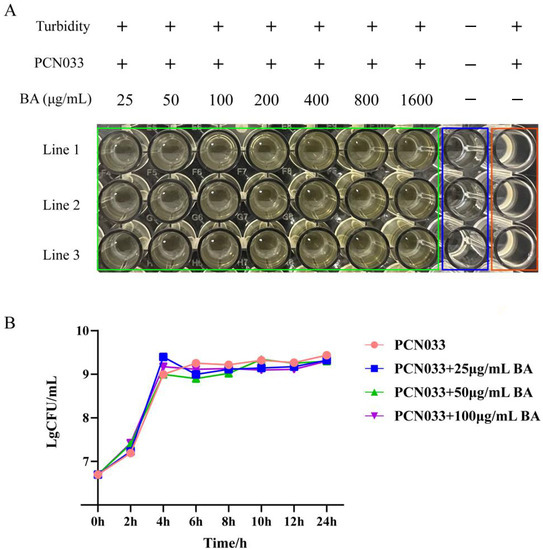 The antibacterial effect of BA on PCN033. (A) The MIC of BA on PCN033. (B) The growth curve of PCN033 with different concentrations of BA.