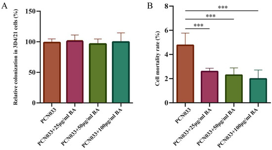 To investigate the effect of BA on the cell damage induced by PCN033, the cytotoxicity abilities of PCN033 on 3D4/21 cells with or without (set as 100%) BA treatment were compared in vitro. Before comparing the cytotoxicity abilities, the time point at which BA does not affect cell proliferation was determined. After co-incubation with 3D4/21 cells for 90 min, the results showed that no significant number of PCN033 cells treated with BA was colonized compared with PCN033 (Figure 3A). The cell mortality rate results showed that the cytotoxicity activities of the BA-treated group were significantly lower than those of the PCN033-infected group (Figure 3B, p < 0.001).
