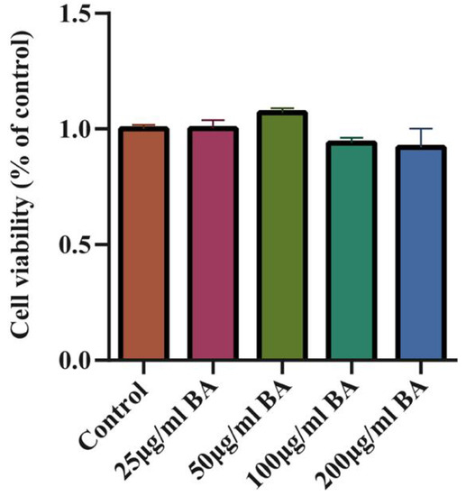 Whether BA had a toxic effect on cells was analyzed by a CCK-8 assay. The results showed that BA (25–200 g/mL) had no effect on the cell viabilities of 3D4/21 cells (Figure 4).