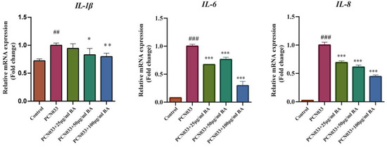 The effects of BA on the transcription levels of PCN033-induced inflammatory factor production in 3D4/21 cells and the transcription levels of inflammatory factors IL-1, IL-6, and IL-8 (3 h). The results show that the transcription level of inflammatory factors IL-1, IL-6, and IL-8 were increased significantly after PCN033 infection and decreased significantly after treatment with BA (## p < 0.01 vs. control; ### p < 0.001 vs. control; * p < 0.05; ** p < 0.01; *** p < 0.001).