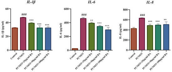 The effects of BA on the expression levels of inflammatory factors induced by PCN033 and the expression levels of inflammatory factors IL-1, IL-6, and IL-8 (3 h). The ELISA results show that the expression levels of the inflammatory factors IL-1, IL-6, and IL-8 increased significantly after PCN033 infection and decreased significantly after treatment with BA (### p < 0.001 vs. control; ** p < 0.01; *** p < 0.001).