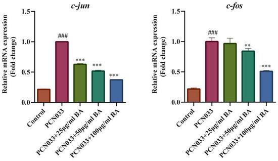 The transcription levels of the inflammatory factors c-jun and c-fos (3 h). The qRT-PCR results show that the transcription levels of the inflammatory factors c-jun and c-fos increased significantly after being infected with PCN033 and decreased significantly after treatment with BA (### p < 0.001 vs. control; ** p < 0.01; *** p < 0.001).